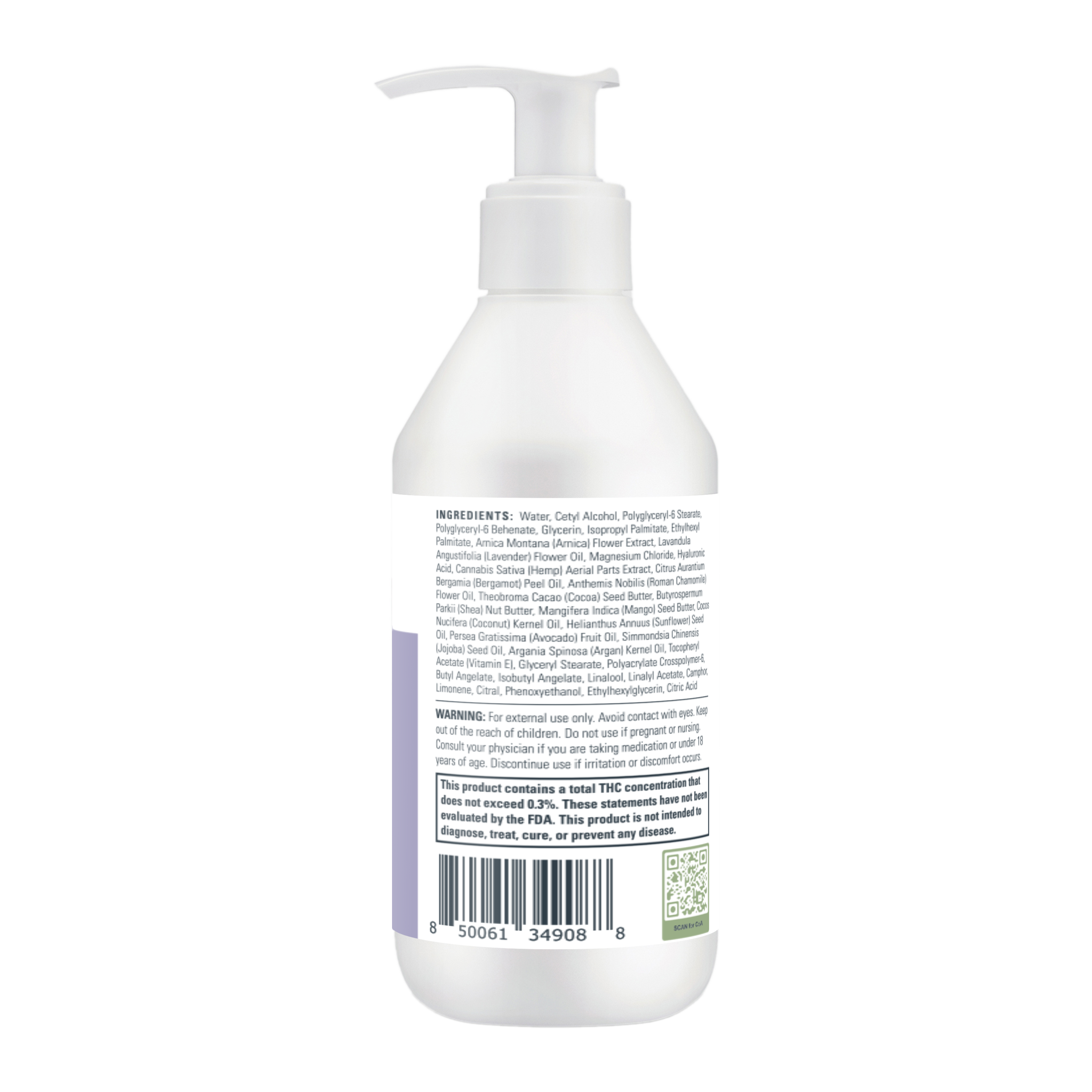 Water, Cetyl Alcohol, Polyglyceryl-6 Stearate, Polyglyceryl-6 Behenate, Glycerin, Isopropyl Palmitate, Ethylhexyl Palmitate, Arnica Montana (Arnica) Flower Extract, Lavandula Angustifolia (Lavender) Flower Oil, Magnesium Chloride, Hyaluronic Acid, CBD Hemp Extract, Citrus Aurantium Bergamia (Bergamot) Peel Oil, Anthemis Nobilis (Roman Chamomile) Flower Oil, Theobroma Cacao (Cocoa) Seed Butter, Butyrospermum Parkii (Shea) Nut Butter, Mangifera Indica (Mango) Seed Butter, Cocos Nucifera (Coconut) Kernel Oil, Helianthus Annuus (Sunflower) Seed Oil, Persea Gratissima (Avocado) Fruit Oil, Simmondsia Chinensis (Jojoba) Seed Oil, Argania Spinosa (Argan) Kernel Oil, Tocopheryl Acetate (Vitamin E), Glyceryl Stearate, Polyacrylate Crosspolymer-6, Butyl Angelate, Isobutyl Angelate, Linalool, Linalyl Acetate, Camphor, Limonene, Citral, Phenoxyethanol, Ethylhexylglycerin, Citric Acid